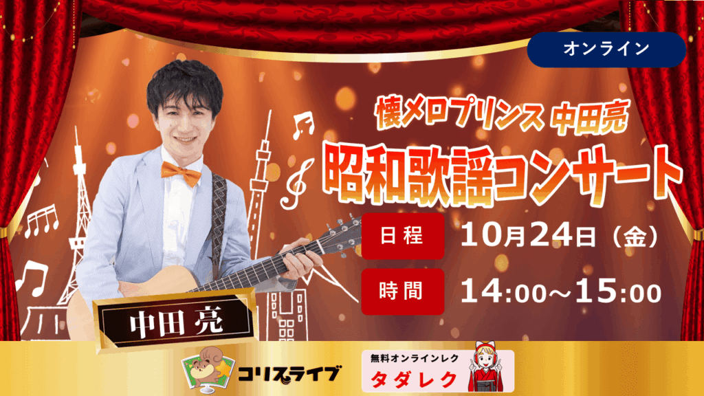 10/24(金)無料コンサート開催決定!! 2025 9/28 お知らせ コリスライブ主催「昭和歌謡コンサート」の無料開催が10月も決定いたしました!今回はタダカヨ様とのコラボ開催で参加費は無料です!下記ページよりお申し込みください! お申し込みページ お知らせ Please シェア!! URLをコピーしました! URLをコピーしました! ベルホーム様のInstagramに掲載されました! 10月の番組スケジュールを更新しました 関連記事 お手軽ハンドメイドコリスボックス】新作を公開しました! 2025年10月2日 【ハンドメイドキット】新作を公開しました! 2025年10月2日 10月の番組スケジュールを更新しました 2025年10月1日 【お手軽ハンドメイドコリスボックス】新作を公開しました! 2025年9月1日 【ハンドメイドキット】新作を公開しました! 2025年9月1日 9/23(火)無料コンサート開催決定!! 2025年8月22日 【お手軽ハンドメイドコリスボックス】新作を公開しました! 2025年8月1日 【ハンドメイドキット】新作を公開しました! 2025年8月1日