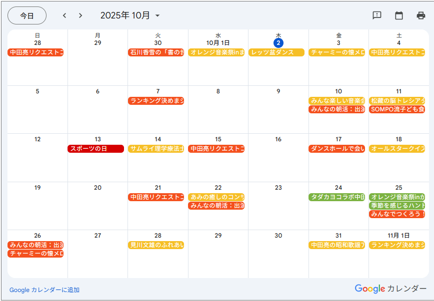 10月の番組スケジュールを更新しました 2025 10/01 お知らせ 10月の番組を更新しました!詳細は下記ボタンよりカレンダーの「10月」をご確認ください。 開催日程はこちら お知らせ Please シェア!! URLをコピーしました! URLをコピーしました! 10/24(金)無料コンサート開催決定!! 【ハンドメイドキット】新作を公開しました! 関連記事 お手軽ハンドメイドコリスボックス】新作を公開しました! 2025年10月2日 【ハンドメイドキット】新作を公開しました! 2025年10月2日 10/24(金)無料コンサート開催決定!! 2025年9月28日 【お手軽ハンドメイドコリスボックス】新作を公開しました! 2025年9月1日 【ハンドメイドキット】新作を公開しました! 2025年9月1日 9/23(火)無料コンサート開催決定!! 2025年8月22日 【お手軽ハンドメイドコリスボックス】新作を公開しました! 2025年8月1日 【ハンドメイドキット】新作を公開しました! 2025年8月1日
