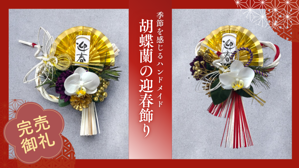 しめ縄に上品な胡蝶蘭を合わせた、優雅で心和むお正月飾りです。一本のしめ縄からお好きな形にアレンジできるので、自分だけの特別な作品づくりをお楽しみいただけます。カラーは金と赤どちらかをお選びください。また、ご希望に応じて来年の干支、馬の干... -